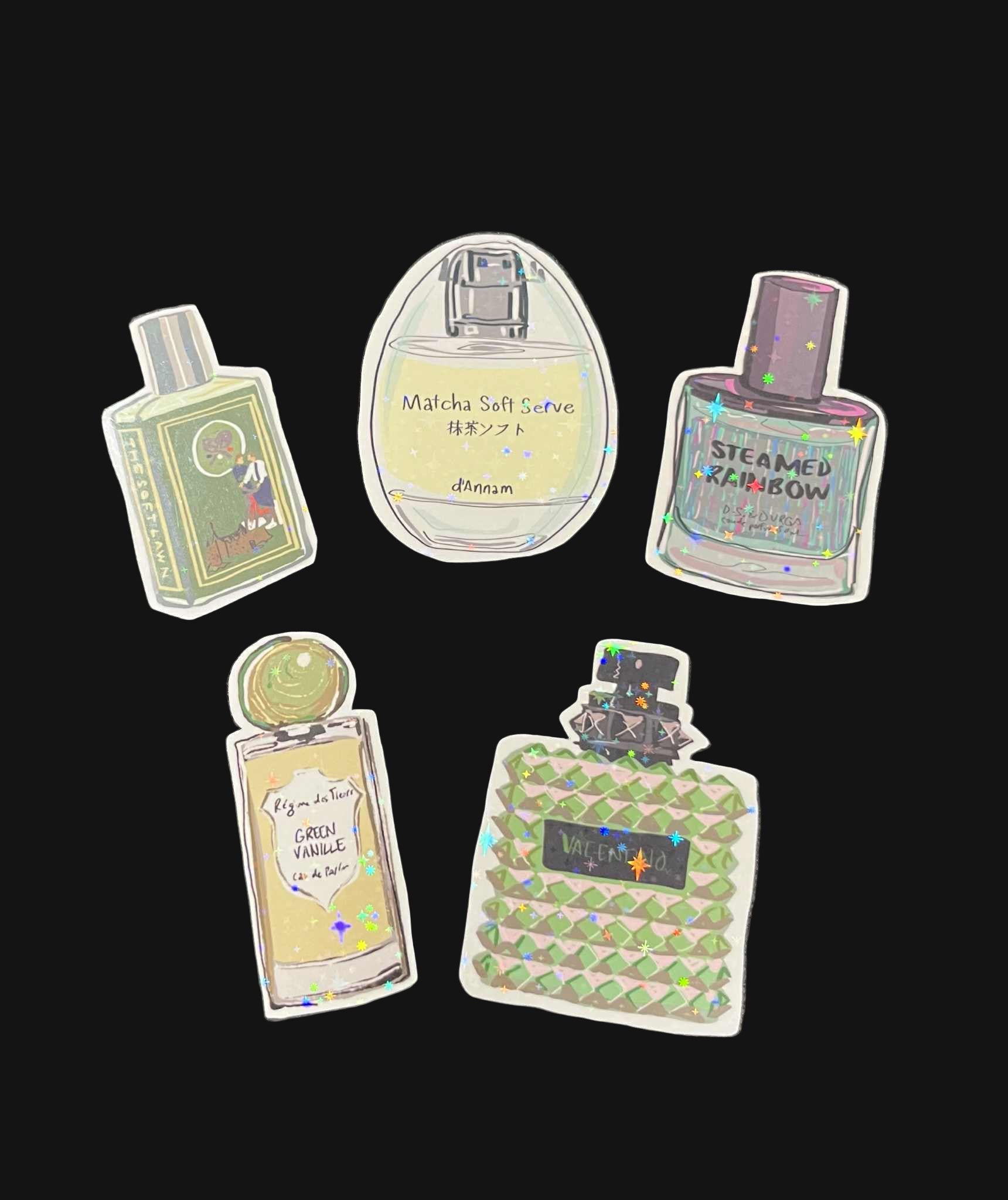 PACK OF 5 PERFUME BOTTLE STICKERS - Contains the following illustrated bottles: