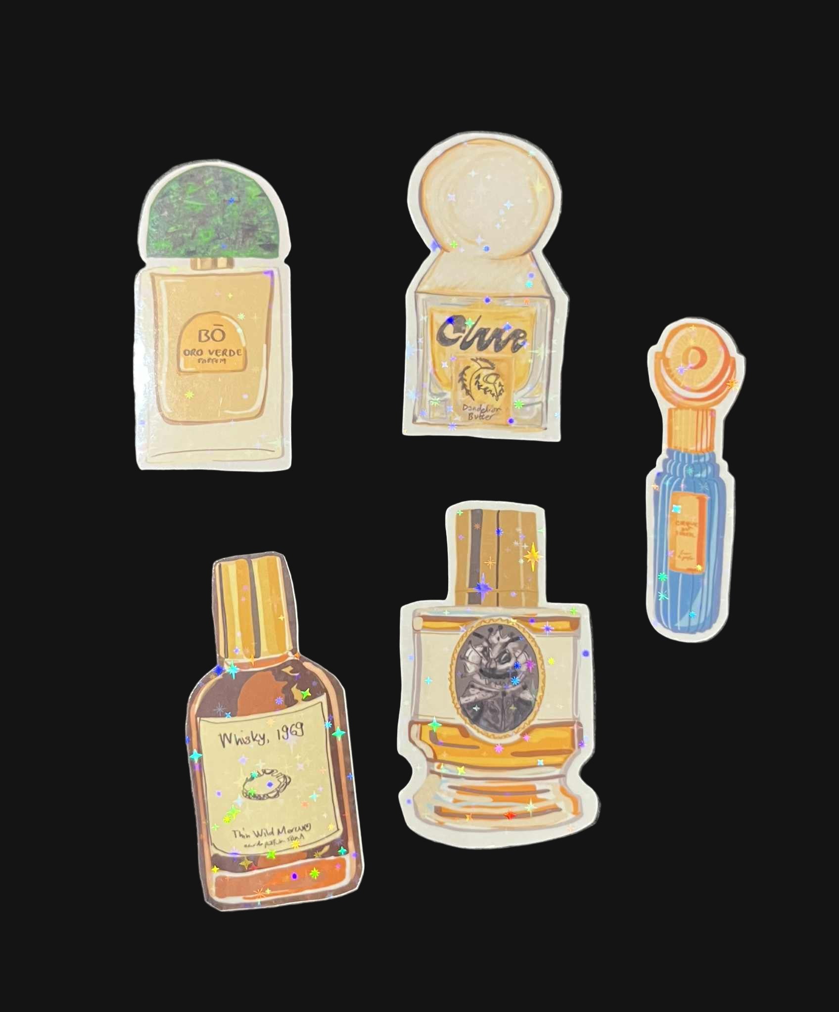 PACK OF 5 PERFUME BOTTLE STICKERS - Contains the following illustrated bottles: