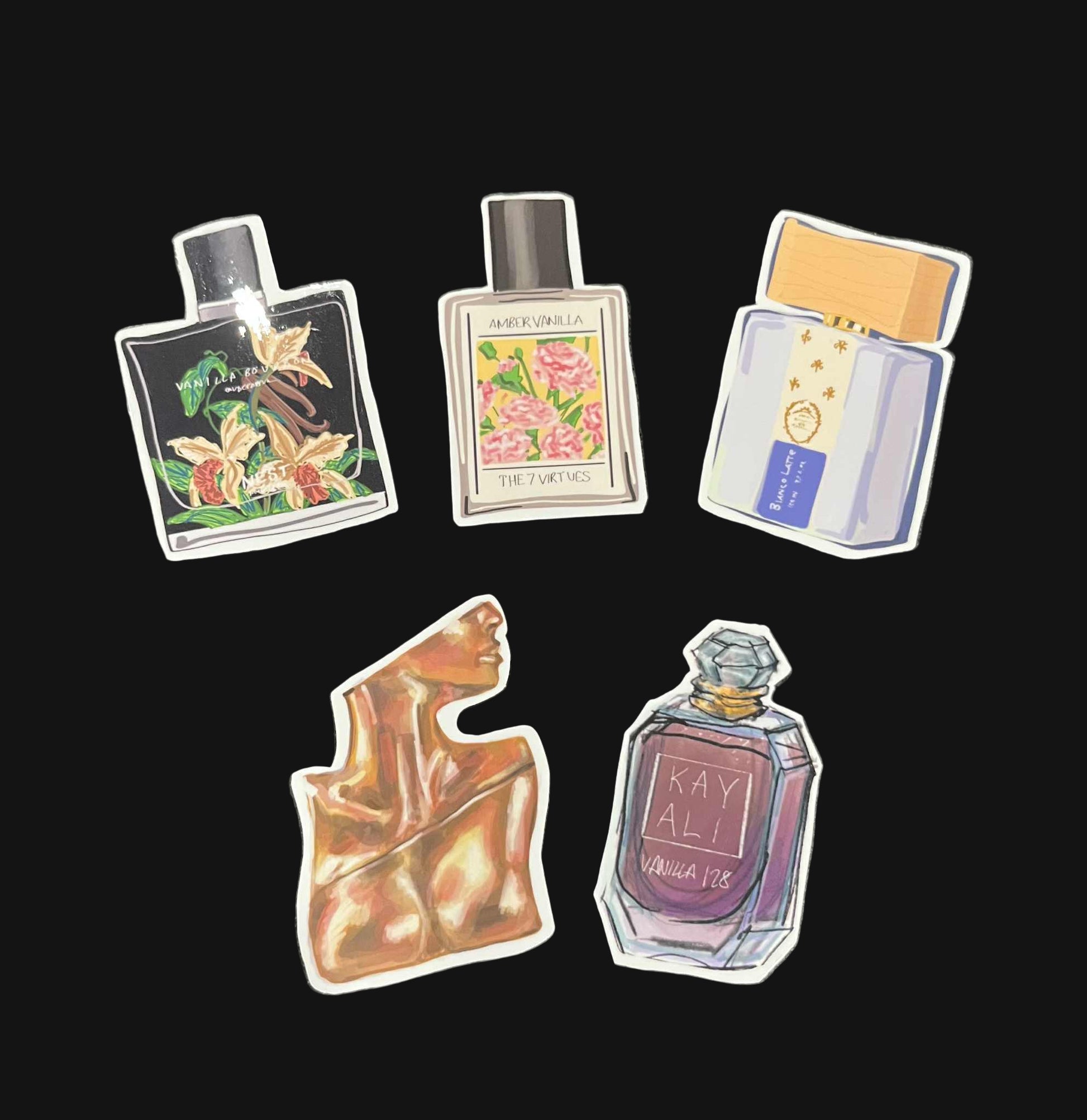 PACK OF 5 PERFUME BOTTLE STICKERS - Contains the following illustrated bottles: